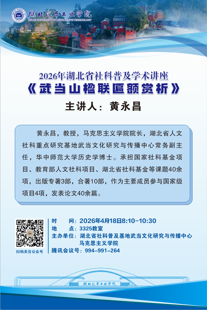 2026年4月18日上午,我校马克思主义学院院长、武当文化研究与传播中心副主任黄永昌教授在三号教学楼3325报告厅作了2026年湖北省社科普及学术讲座,题目为“武当山匾额楹联赏析”。我校旅游管理专业学生参加了线下讲座,还有部分师生、武当山世界遗产保护、文物及文化旅游从业人员通过线上参加了本次活动。